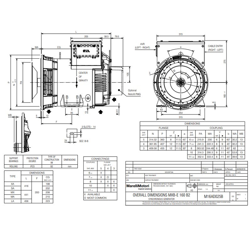MARELLIMOTORI MXB-E 160MA4 is a Alternator with a power of 17.5KVA 8KW, this unit has a self-exciting and self-regulating Brushless operation.