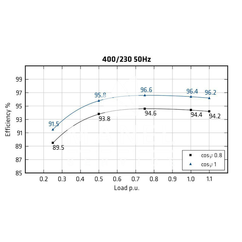The ECO40-2S/4 consists of a fixed stator with inclined slots and a rotating inductor, and is equipped with a damping cage as standard. The high-quality two-component insulating resin used in the MeccAlte ECO40-2S/4 is a polyester specially developed for use in vacuum or immersion and drip impregnation machines. It has superior adhesion strength, high chemical and moisture resistance and is suitable for use up to 212°C.