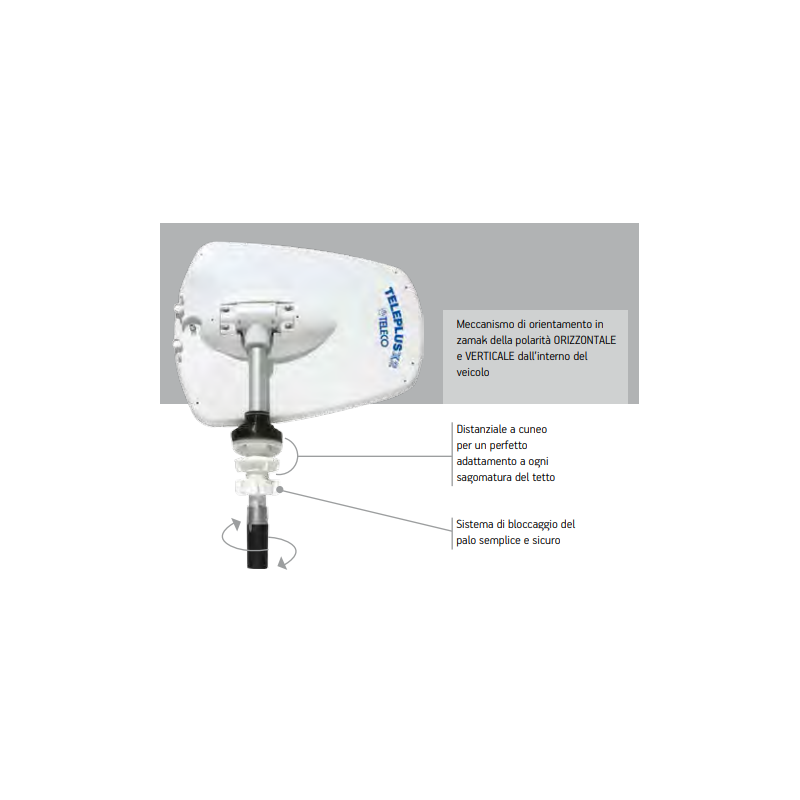 Thanks to its innovative polarity orientation mechanism, the TELECO TELAIR TeleplusX2-39U allows for the reception of TV signals transmitted in both horizontal and vertical polarities, optimizing viewing quality. This feature is particularly useful in countries such as Italy and England, where the distribution of vertically polarized signals is increasing with the advent of digital broadcasting.