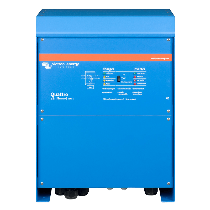 The VICTRON Quattro 48/8000/110-100/100 is an inverter and charger with pure sine wave output, combined with multiple functions, parallel capability, and remote control.