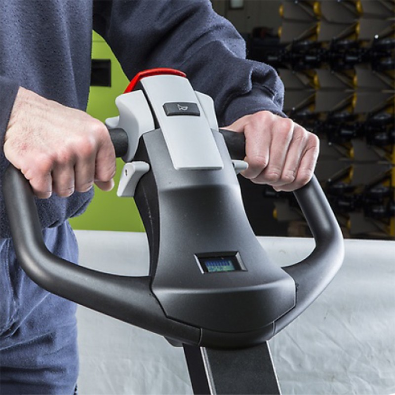 The PRAMAC LIFTER GX10/42 stacker features an integrated ergonomic technopolymer tiller arm that includes as standard equipment the accelerator, proportional controls for the forks, safety button, horn, turtle button, display with hour meter and battery status indicator.