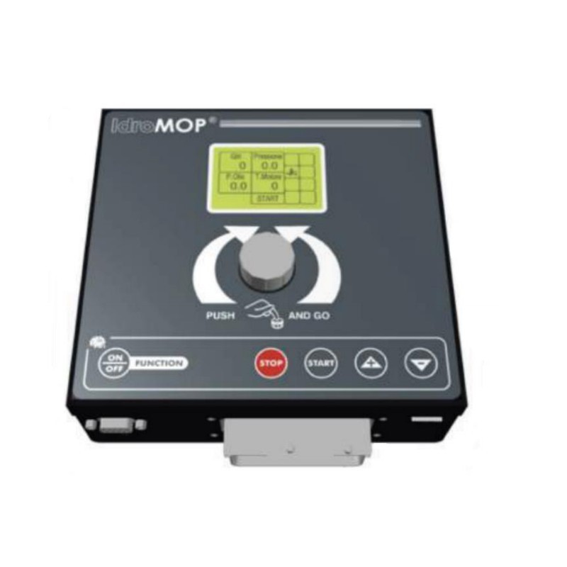 The motor pump is complete with EasyMOP control unit for manual control of the water pressure with self-learning of the working point. Water system protection for dry running, minimum and maximum pressure, under pressure and over pressure. Engine protection for insufficient oil pressure, over-temperature, belt breakage (lack of battery recharge), minimum fuel level, low coolant level, over engine speed, low diesel pressure. Actuator control (accessory to be purchased separately) for engine deceleration management in case of alarm or end of work. Start/Stop from external contact. Display on screen of general maintenance warning, hour meter, rev counter, fuel level, battery voltmeter, pump protection exclusion, water pressure gauge. Work time setting from 00:01 to 47:59 hours/minutes.