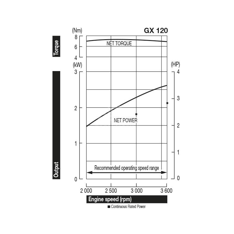 Fuel Gasoline Engine OHC ad albero orizzontale, 4 tempi, cilindro in ghisa Ignition A transistor contactless Starting system Manual Engine capacity (cm³) 118 Number cylinders 1 Cylinders' position Inclined to 25° Oil capacity (L) 0.6 Cooling Forced air Bore x stroke (mm) 60 x 42 Compression ratio 8.5 : 1 Net power (kW) 2.6 Nominal power continuous 1.8 KW (2.4 HP) / 3000 rpm - 2.1 KW (2.8 HP) / 3600 rpm Maximum torque 7.3 Nm / 0.74 kgfm / 2500 rpm Fuel tank capacity (L) 2 Consumption (L/h) 1 Running time (h) 2 Length (mm) 305 Width (mm) 346 Height (mm) 329 Dry weight (Kg) 13 Engine manufacturer Honda Condition New