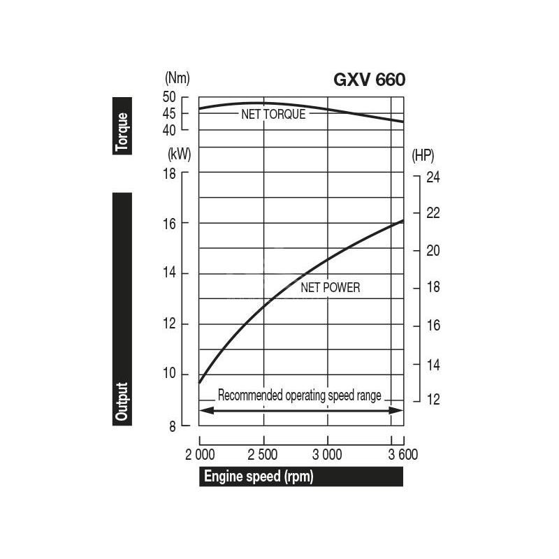 Fuel Gasoline Engine OHV vertical shaft, 4 stroke, cast iron cylinder Ignition Digital CDI with variable ignition advance Starting system Electric Engine capacity (cm³) 688 Number cylinders 2 Cylinders' position V to 90° Oil capacity (L) 2.2 Cooling Forced air Bore x stroke (mm) 2 / 78 x 72 Compression ratio 9.3 : 1 Net power (kW) 16.0 Nominal power continuous 11.0 KW (14.8 HP) / 3000 rpm - 12.5 KW (16.8 HP) / 3600 rpm Maximum torque 48.3 Nm / 4.93 kgfm / 2500 rpm Lubrication Forced Carburetor Double body, solenoid fuel supply interruption Consumption (L/h) 5.3 Length (mm) 449 Width (mm) 420 Height (mm) 492 Dry weight (Kg) 46.7 Engine manufacturer Honda Condition New