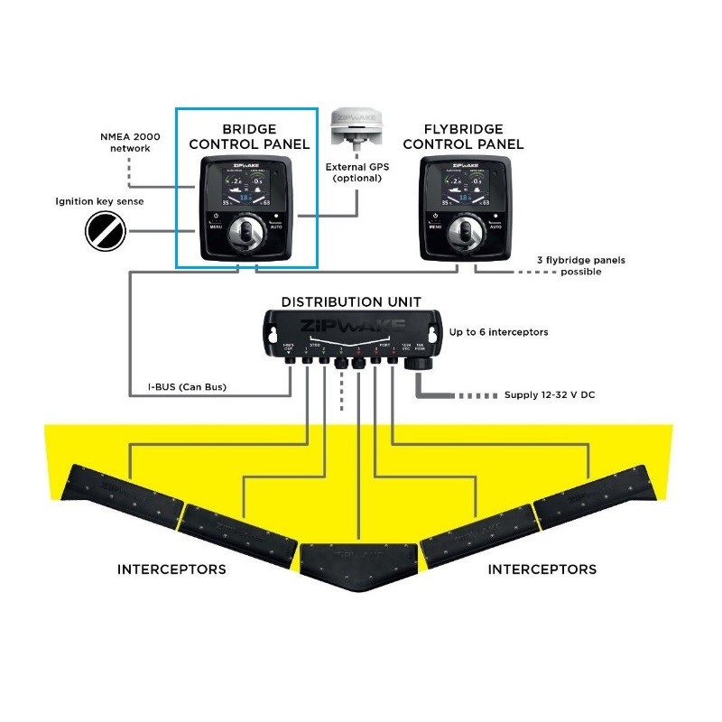 NMEA2000 equipment can be connected. The system can also be connected to the ignition key for automatic system power-on. A waterproof cap conceals the USB interface that allows for future software upgrades and ensures that the Zipwake Dynamic Trim Control System is future-proof.