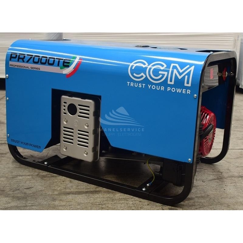 CGM PR7000TE is a 7 KVA single-phase/three-phase generator set with Honda engine powered by STAGE V petrol at 3000 rpm, compact and easy to use, mounted on a fixed base with vibration dampers.