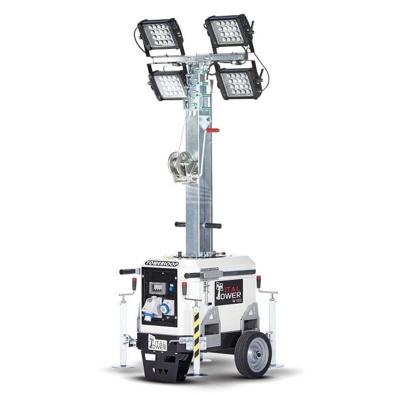 ITALTOWER TOWERLOOP PRO03 is a light tower equipped with 4 led projectors 320W high brightness with directional optics and handles for easy rotation, with a lifting system that allows an extension up to 7 mt.