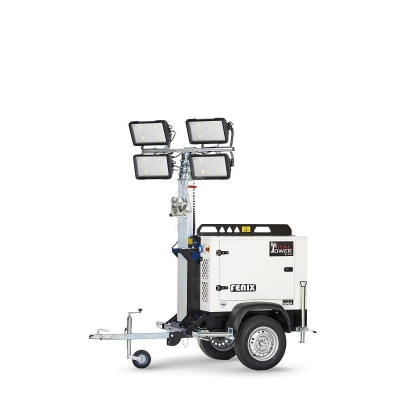 The ITALTOWER FENIX PRO16 Light Tower is equipped with a Kohler 15KD350 engine powered by Diesel, capable of delivering a power of 3.5KW to serve 4 LED lamps 1600W.