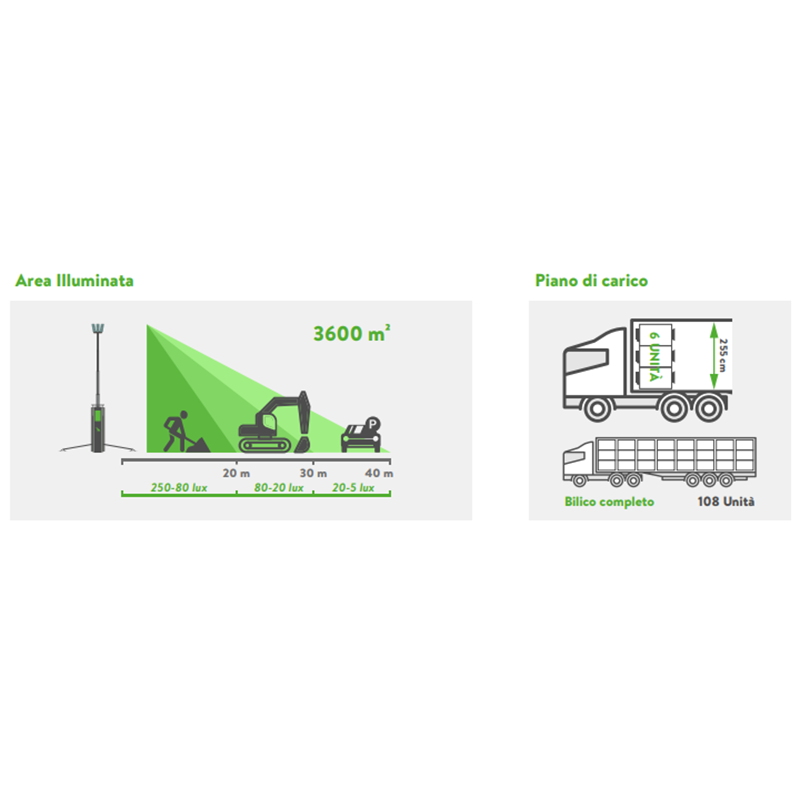 With a total brightness of 73,800 lumens and an illuminated area of 3600 m², it competes with traditional 1600W halogen towers while consuming 70% less energy.