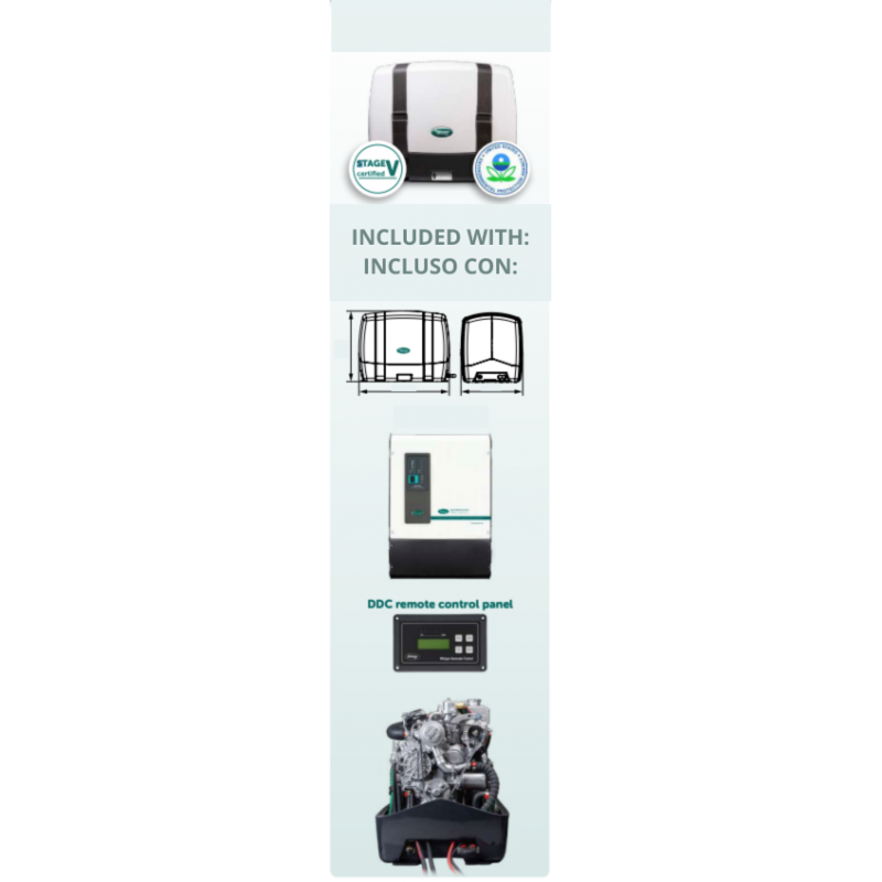 The WHISPER PICCOLO18 M-GV18 marine generator is equipped with a "mobile" STAGEV engine, as required by European Regulation 2016/1628. These new engines make it possible to exponentially reduce the particulate and nitrogen oxide emissions released by the generator into the environment, and guarantee a 200% reduction in environmental impact compared to standard engines.