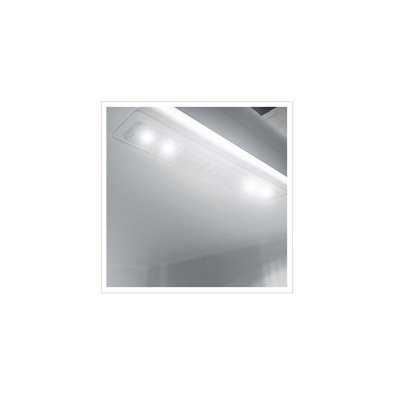 it offers an upper compartment for the refrigerator and a lower one for the freezer,