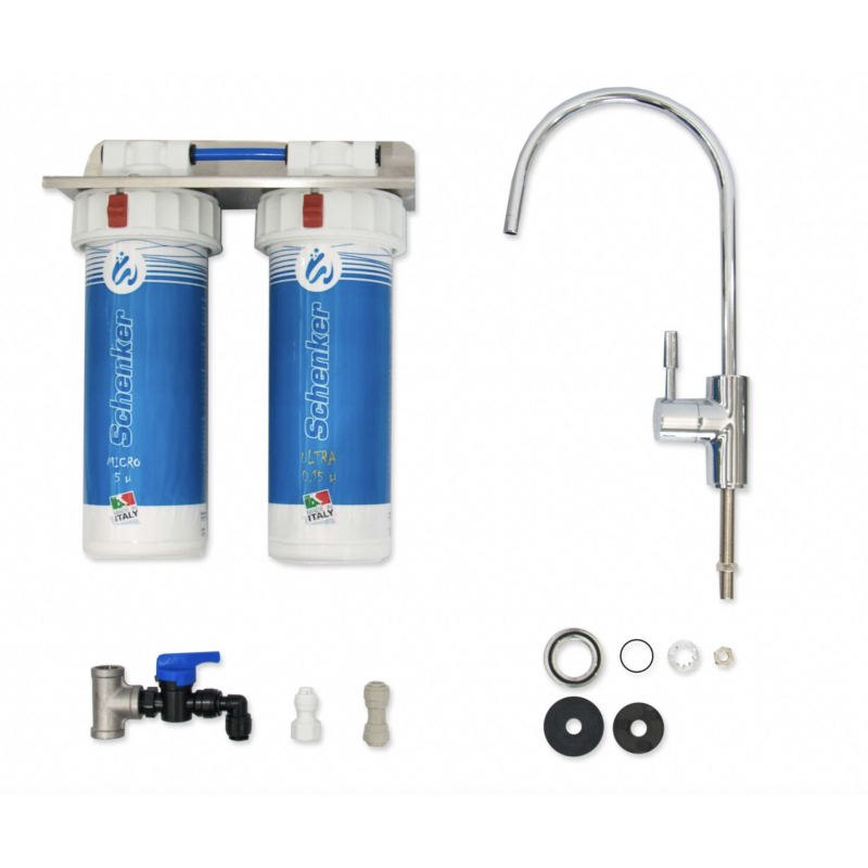 A livello tecnico, il primo filtro è formato da un “carbon block” che assolve al compito di eliminare le impurità fino a 5 micron, il cloro e altri sapori e odori indesiderati, mentre il secondo filtro trattiene impurità fino a 0,15 micron compiendo quindi la filtrazione raffinata dell’acqua e riducendo l’eventuale carica batterica del 99,99%.