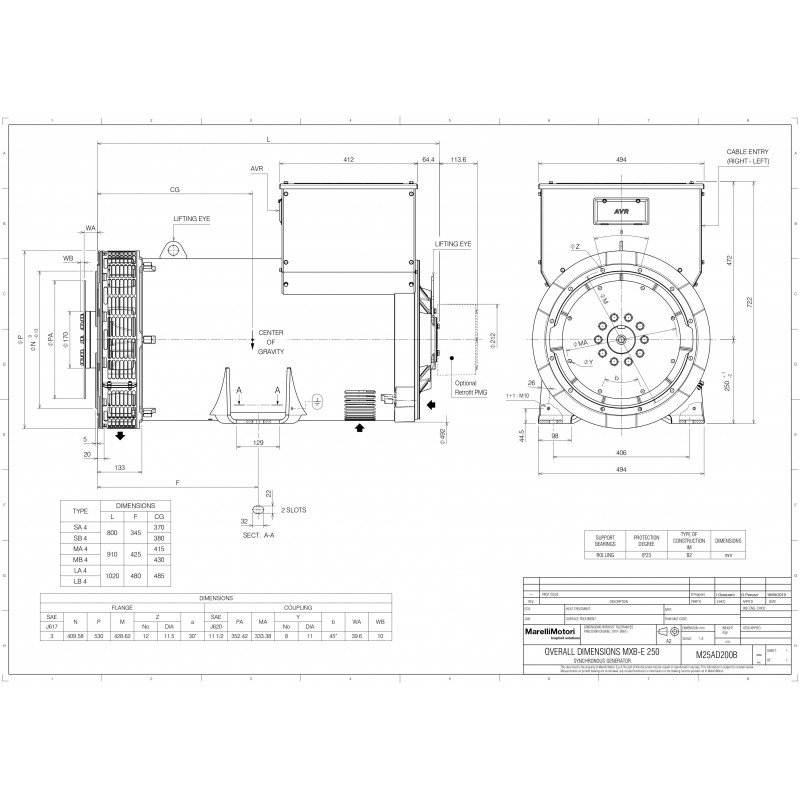 MARELLIMOTORI MXB-E 250MB4 è un Alternatore con una potenza di 250KVA 200KW, questa unità ha un funzionamento Brushless autoeccitante ed auto regolanti.