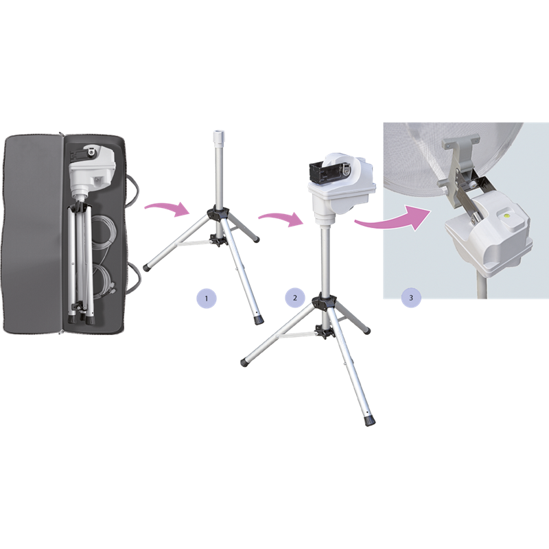 TELECO TELAIR ACTIVSAT 53SQ è sufficiente aprire il treppiede, montare sulla sua cima il gruppo motore, inserire l'antenna satellitare e collegare il cavo all’apposita presa esterna del veicolo. L'installazione è davvero intuitiva, rapida e semplice e non richiede strumenti aggiuntivi.