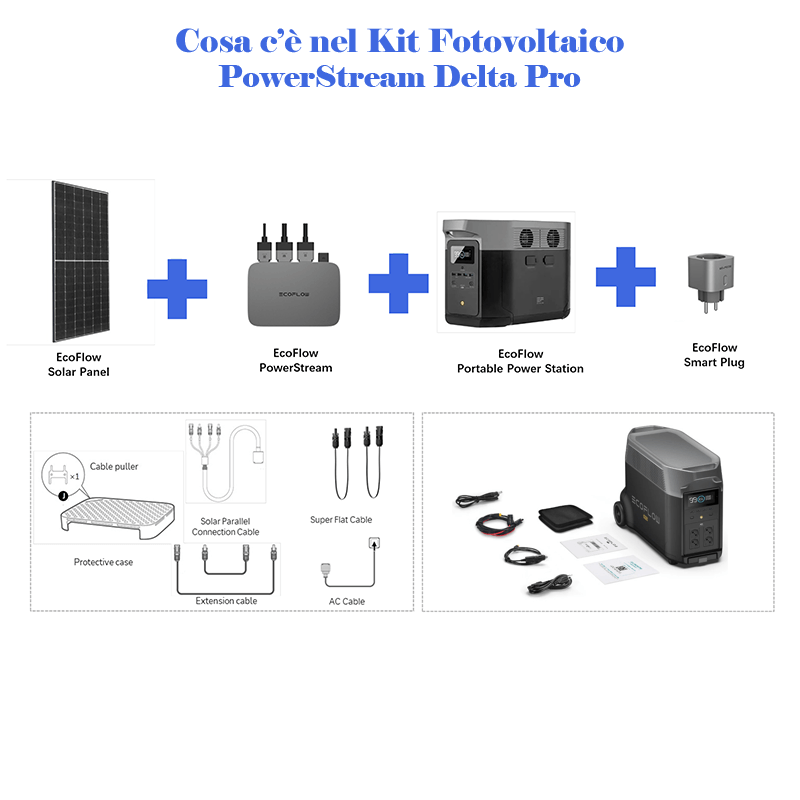 Il kit viene fornito completo di batteria domestica portatile ECOFLOW DELTA PRO. Per tutte le informazioni sul prodotto ti invitiamo a prendere visione della scheda completa cliccando QUI