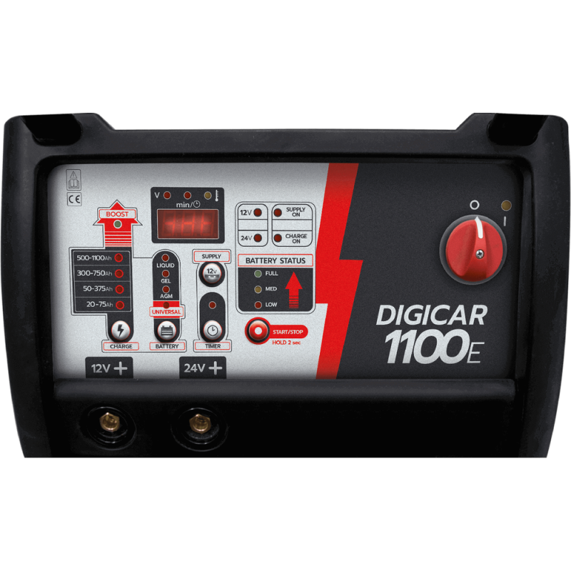 HELVI DIGICAR1100E è un caricabatterie/avviatore professionale di nuova generazione a controllo elettronico (microprocessore). L'evoluto pannello di controllo del caricabatterie HELVI DIGICAR1100E permette all'utente di selezionare il tipo di batterie da caricare (AGM, GEL, LIQUID o Universale), 4 diversi livelli di carica (a seconda della capacità della batteria), e/o di impostare un tempo di carica (TIMER). Il controllo elettronico del caricabatterie HELVI DIGICAR1100E permette un'ottimizzazione della carica (100%) e non richiede la rimozione della batteria. Non è prevista la supervisione da parte dell'utente essendo il processo di carica totalmente controllato e sicuro. Una volta terminata la fase di carica, il dispositivo entrerà in fase di mantenimento. La tensione della batteria (12 V o 24 V) previo corretto collegamento dei cavi, viene indicata sul display a bordo. Durante la carica è possibile visualizzare la tensione della batteria ed il tempo residuo. È inoltre sempre visibile lo status della batteria tramite 3 LED a bordo pannello (Basso, Medio, Carica). Il caricabatterie HELVI DIGICAR1100E è dotato inoltre di avanzati sistemi di controllo tra i quali: inversione polarità, sovracorrente, indicazione batteria guasta, avviamento sicuro e protetto.