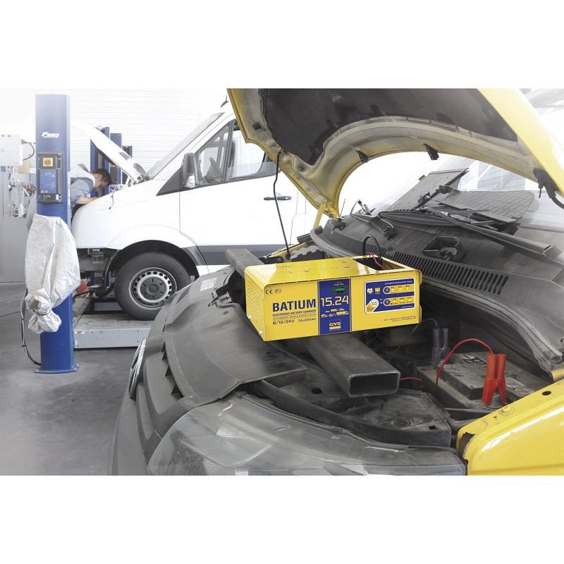 GYS BATIUM 15-24 carica al 100% tutti i tipi di batterie al piombo 6/12/24V ed è ideale per batterie di moto, veicoli d'epoca, veicoli leggeri, furgoni, macchine agricole, attrezzature per lavori pubblici, mezzi pesanti e autobus (fino a 225Ah).