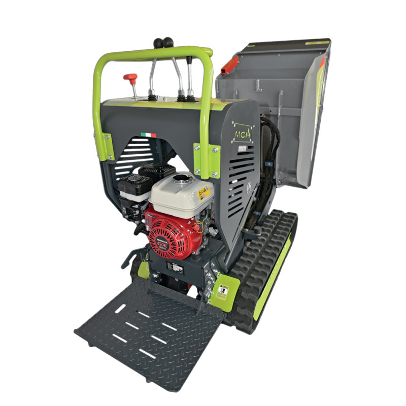 Il carrello cingolato MCH MINIDUMPER H500GX è dotato di motore Honda GX200 con alimentazione a Benzina, con una capacità di carico fino a 500Kg.