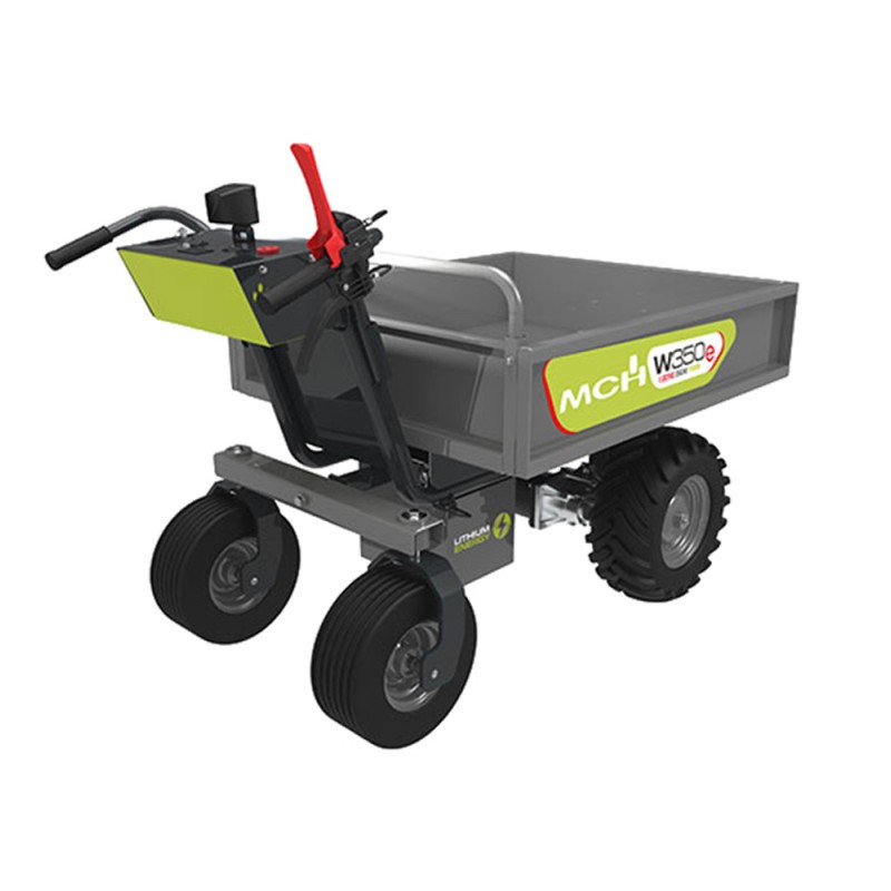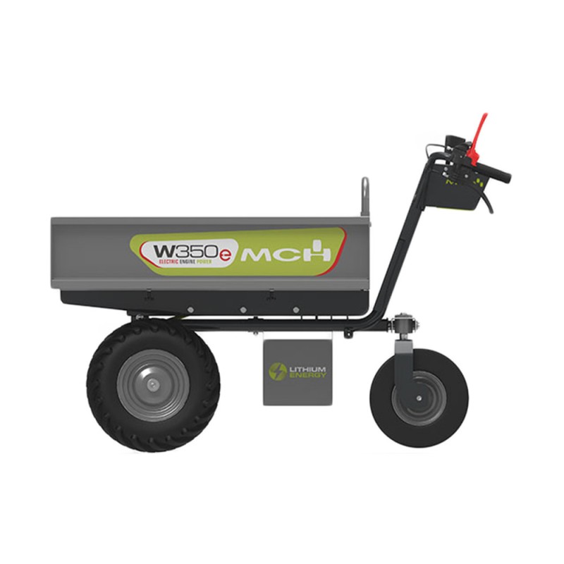 MCH W350E è un trasportatore a motore elettrico dotato di cassone apribile e ribaltamento manuale, con una capacità di carico massima di 350Kg.