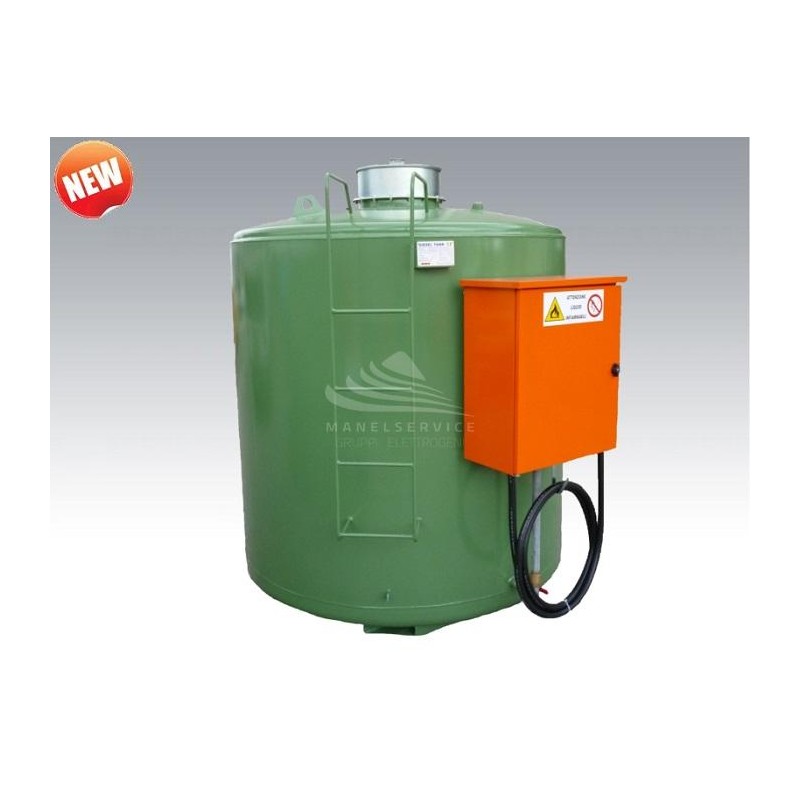 Serbatoio a doppia parete, ad asse verticale, realizzato in acciaio al carbonio EN 10025. Il serbatoio esterno di protezione ha capacità di contenimento pari al 100% del serbatoio interno. La struttura è sorretta da gonna di supporto e da barre inferiori che permettono la movimentazione a vuoto tramite muletto.