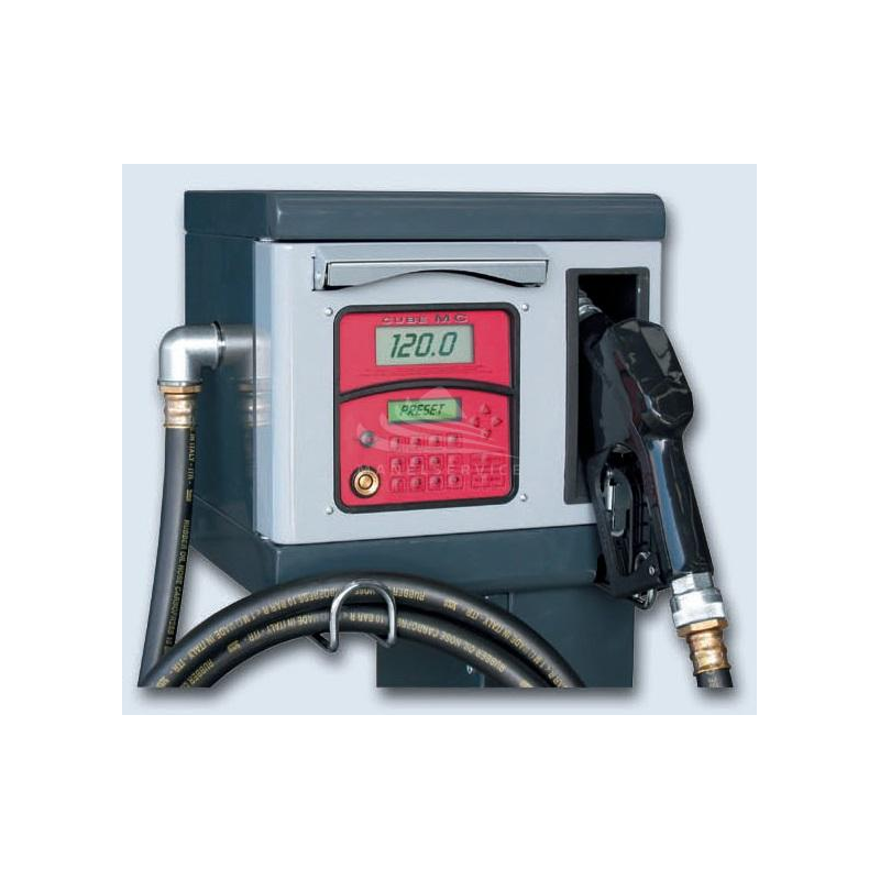 Filtro in aspirazione; elettropompa autoadescante portata massima 70 Lt/min con filtro e by-pass incorporato, motore monofase 230 V; contalitri ad uso privato, con parziale azzerabile e totalizzatore progressivo, esente da verifica metrica; tubo flessibile da 5 metri con raccordi a pressione; pistola di erogazione automatica con raccordo girevole; portapistola integrato con leva di marcia/arresto pompa esterno lucchettabile.