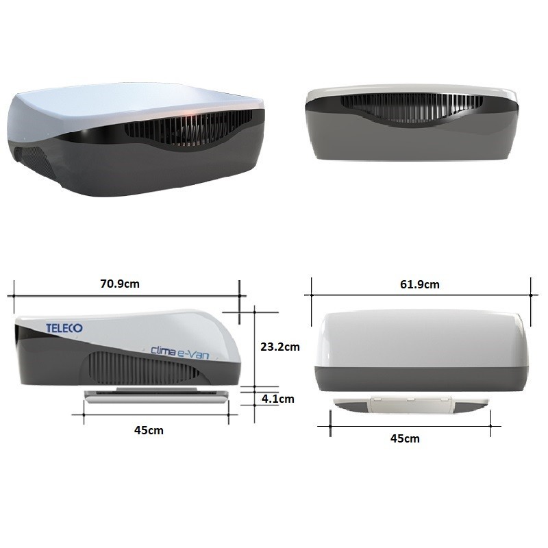 TELECO CLIMA E-VAN 5400H è il condizionatore da tetto più piccolo del mercato, lungo solo 71cm e alto 23 cm, progettato sopratutto per i Camper Van, è la soluzione ideale per essere installato sui tetti di piccole dimensioni senza dovere eliminare l'oblò.