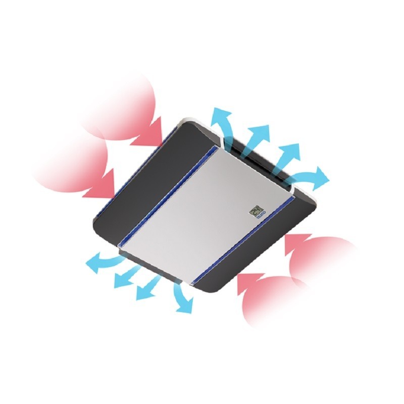 Il diffusore interno piccolo e con design Moderno, solo circa 4,2 cm di spessore, può essere installato facilmente proprio per le sue dimensioni ridotte. Dotato di display multifunzione azzurro e di luci a led di facile accensione e spegnimento attraverso il telecomando