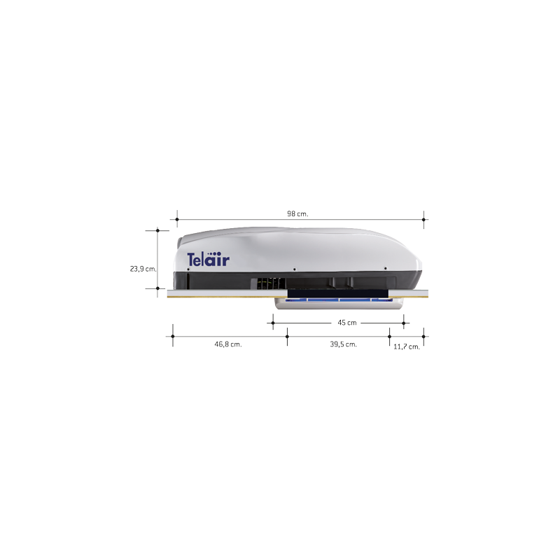 Condizionatore TELAIR SILENT 8100H monoblocco automatico con pompa di calore progettato appositamente per essere installato sul tetto di camper e caravan di medie e grandi dimensioni (particolarmente indicato su veicoli da 6,5 a 8 metri di lunghezza). Particolare cura è stata dedicata alla silenziosità sia interna che esterna del condizionatore TELAIR SILENT 8100H con pompa di calore.