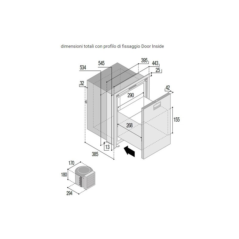 Doppia posizione della porta (DOOR INSIDE-DOOR OUTSIDE) con un unico profilo di fissaggio per una maggiore flessibilità di installazione.