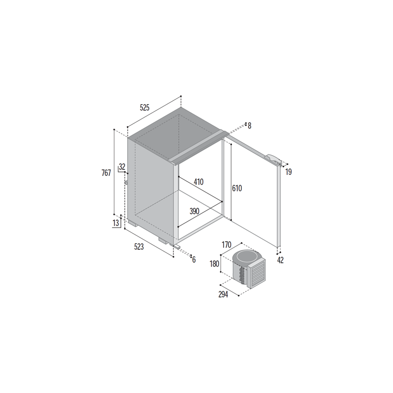 767 mm di altezza e 565 mm di profondità, con tre compartimenti e una porta reversibile.