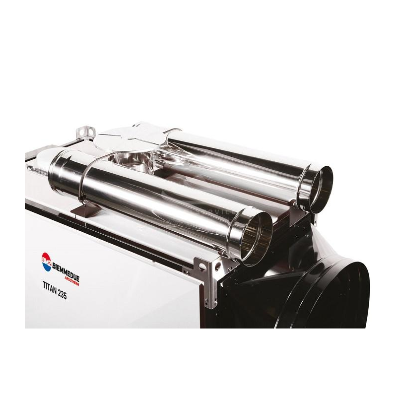 BM2 TITAN 235T è dotato di ventilatore centrifugo che, oltre ad essere molto silenzioso, garantisce elevata prevalenza (500 Pa), caratteristica consigliabile in particolare per installazioni ove è prevista lunga canalizzazione. La camera di combustione a 5 giri di fumi garantisce inoltre un rendimento termico del 96%.