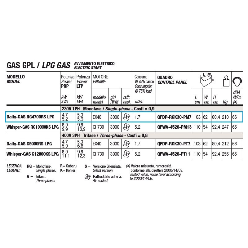 CARATTERISTICHE TECNICHE DEL GENERATORE GENMAC Daily-GAS RG4700HS LPG 5,9KVA