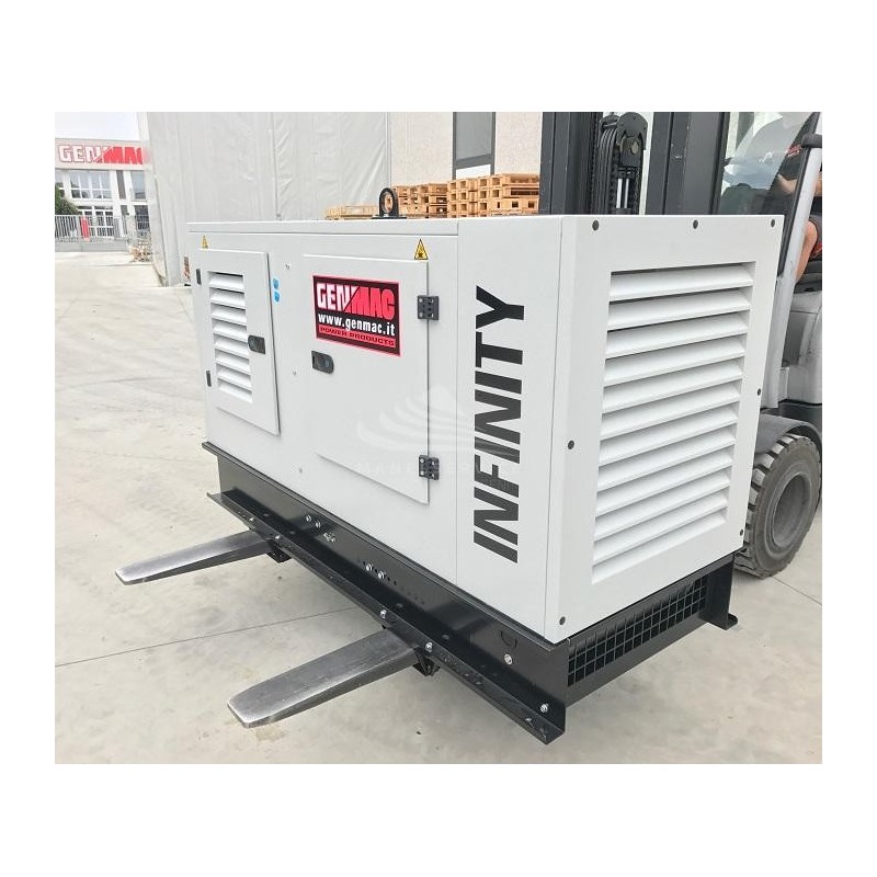 Il generatore Genmac silenziato è stato realizzato con un telaio di alte prestazioni per ridurre al minimo la pressione sonora. il Telaio è realizzato con piastre in acciaio realizzato secondo le norme UNI S235JR, completo di supporti antivibranti in gomma.