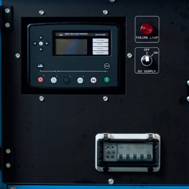 Questo gruppo elettrogeno è dotato di avviamento elettrico, con batteria da 12 V, ed è dotato di centralina Deep Sea DSE7310 MKII che consente di visualizzare di tutti i parametri elettrici del motore e del generatore, delle funzioni, stati del gruppo elettrogeno, gestire interamente il gruppo e di visualizzare, in caso si presentassero, gli errori o allarmi del sistema.
