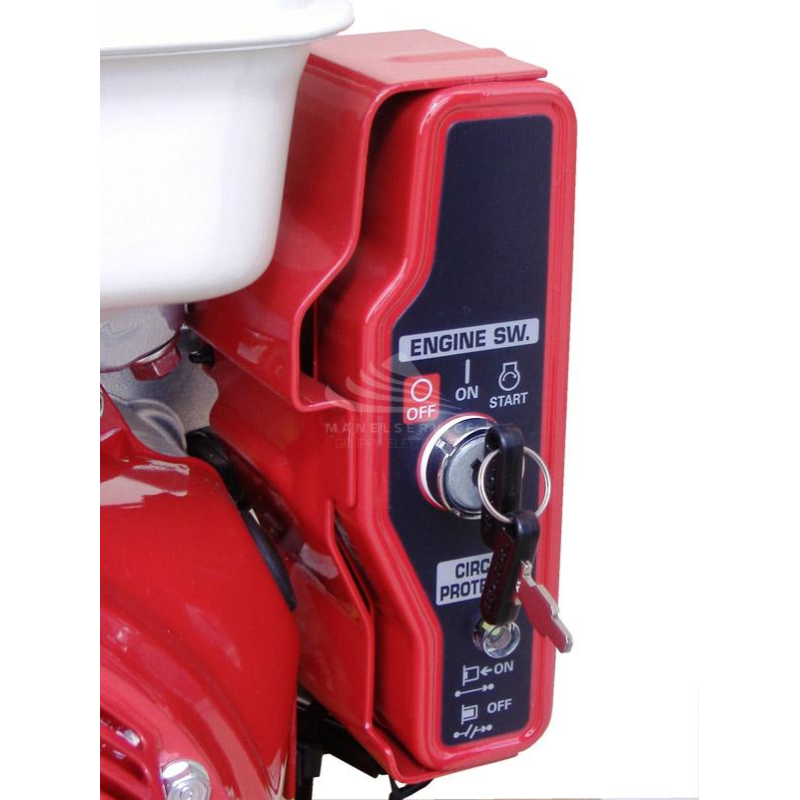 Gruppi elettrogeni con motore a benzina HONDA originale in robusto telaio aperto con potenza da 4,5 a 7,5 KVA, monofase o trifase/monofase, 3000 giri/min, avviamento a chiave compresa batteria e quadretto elettrico con prese e protezione di serie.