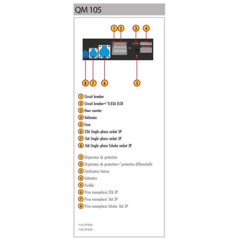 Pannello di distribuzione con prese di uscita e interruttore di circuito opzionale, 0.03 A ELCB opzionale