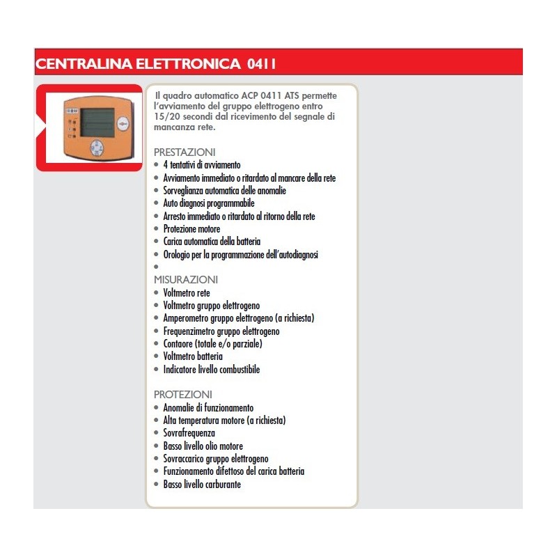 Il quadro automatico ACP 0411 ATS permette l’avviamento del gruppo elettrogeno entro 15/20 secondi dal ricevimento del segnale di mancanza rete.