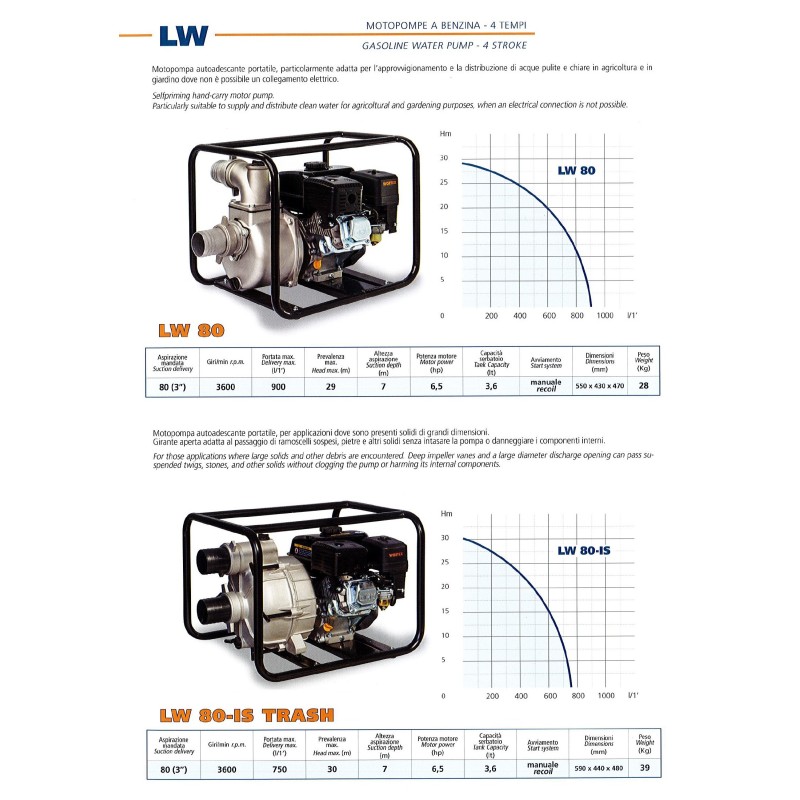 CARATTERISTICHE TECNICHE Motopompa BINDA Benzina LW 80IS TRASH