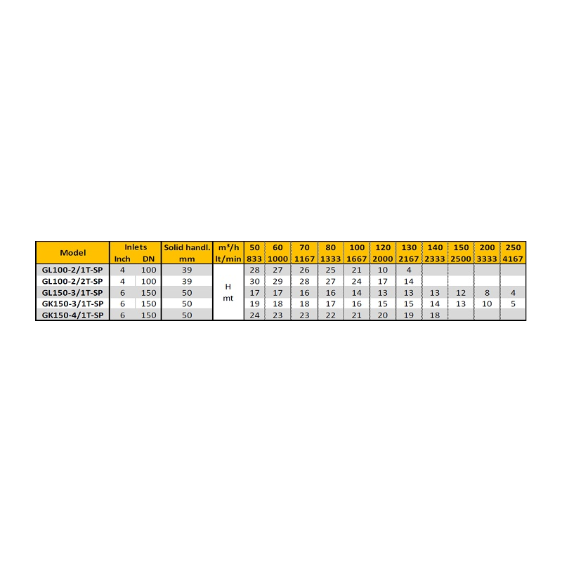 Motopompa autoadescante serie G da 18.8 KW con diametro 4'' per acque cariche. Nelle immagini tabella con le portate e la prevalenza.