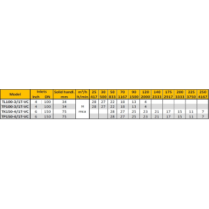 Motopompa vuotoassistita serie T da 36.4 KW con diametro 6'' per acque cariche. Nelle immagini tabella con le portate e la prevalenza.