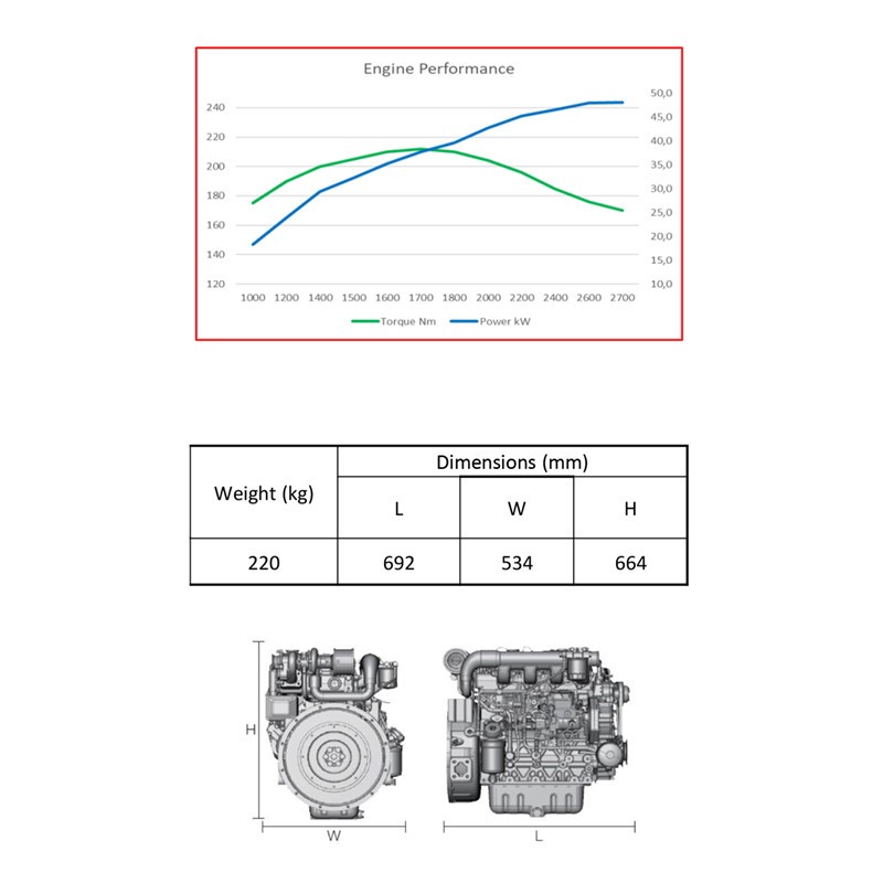 Potenza nominale continua 1500 giri: 36 kW (48 HP)