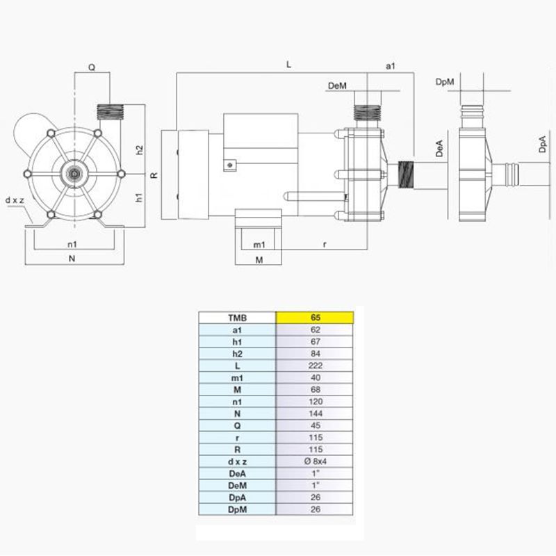 Pompa centrifuga a trascinamento magnetico di particolare silenziosità. Corpo pompa e girante in materiale plastico caricato con resina di vetro. Motore ventilato adatto per funzionamento con temperatura ambiente max 45°C. Base in acciaio inox con antivibranti in gomma.