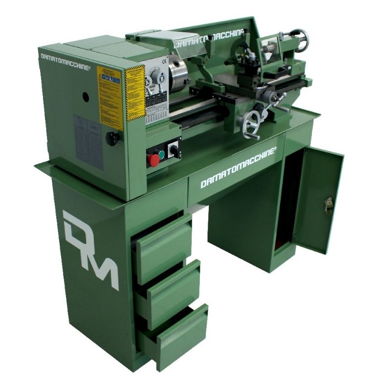 Il tornio DAMATOMACCHINE NEWTON 20 plus viene fornito in versione standard con il suo nuovo basamento (dotato di cassetti e sportelli contenitori), un mandrino a 3 pinze (tre interne e tre esterne), due contropunte fisse con attacco conico, n°2 lunette e tutti gli ingranaggi, le sue chiavi di montaggio.