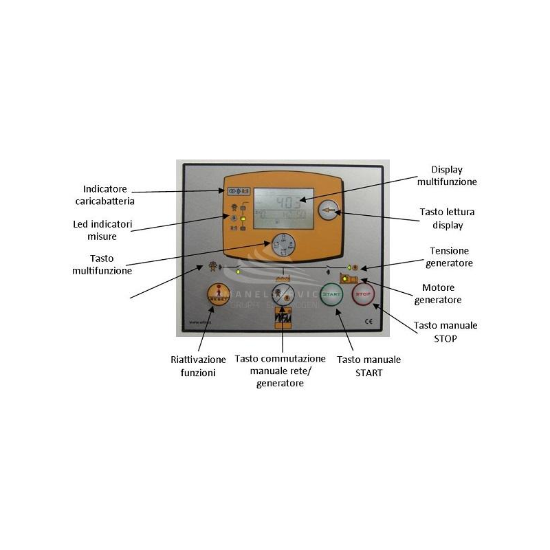 Completo di caricabatteria a 12V per il mantenimento della batteria di avviamento del generatore, interruttori di commutazione rete/gruppo con contatti quadripolari, oltre a disporre di test automatico settimanale per il corretto funzionamento di avvio/spegnimento automatico.