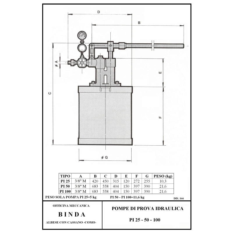 POMPA PI: Pompa manuale di prova idraulica. Corredata di serbatoio, manometro, serpentina e rubinetto esterno a 2 spilli (intercettazione e scarico). La PI 35 ha il rubinetto di scarico incorporato. Tubo erogatore a richiesta.