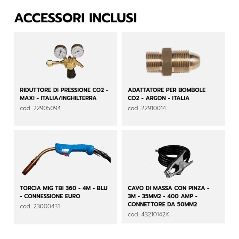 La saldatrice HELVI MAXIMIG 408 è dotata di una torcia con attacco euro, un riduttore di pressione, un tubo gas, una pinza e un cavo di massa. È inoltre dotata di un timer per la saldatura a punti e di un display per la visualizzazione della corrente e della tensione d'arco.