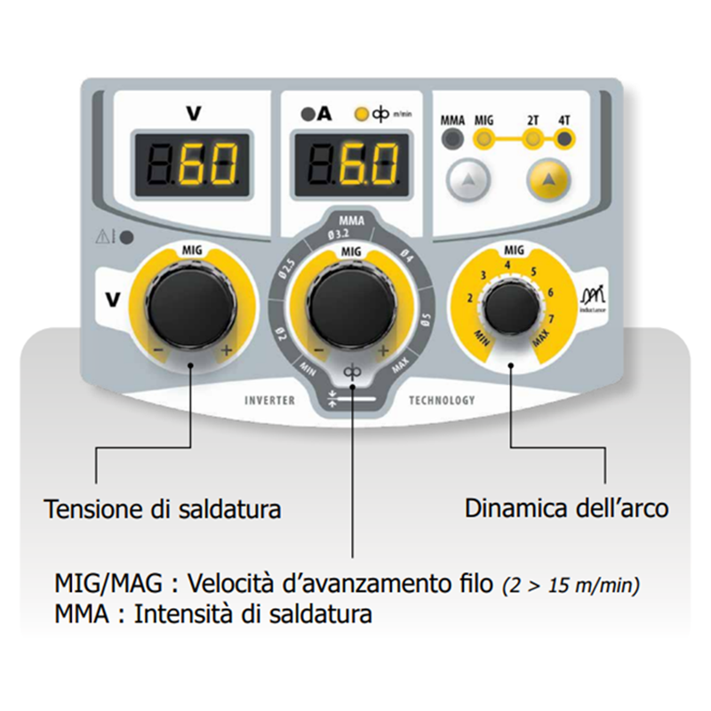 3 processi di saldatura: MIG/MAG (filo di acciaio, acciaio inossidabile, alluminio), filo animato (inversione di polarità), MMA (elettrodi basici e rutili fino a Ø 5 mm)