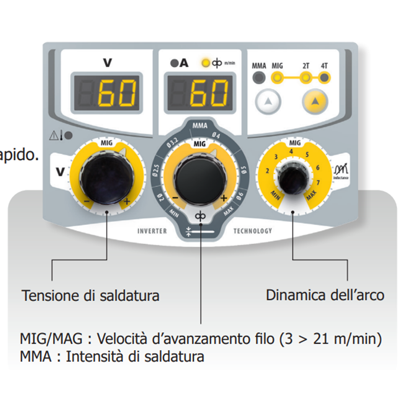Aiuto alla saldatura: la tabella sul frontale aiuta a impostare facilmente la tensione e il diametro del filo in base allo spessore del materiale da saldare.