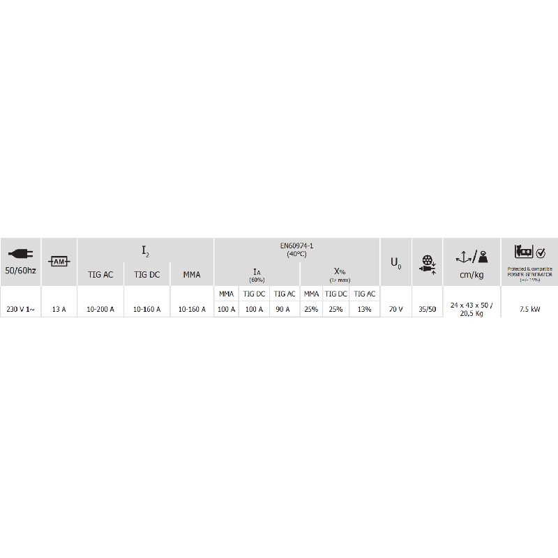 Corrente di Saldo: da 10 a 200 A (TIG AC), 10 a 160 A (TIG DC)