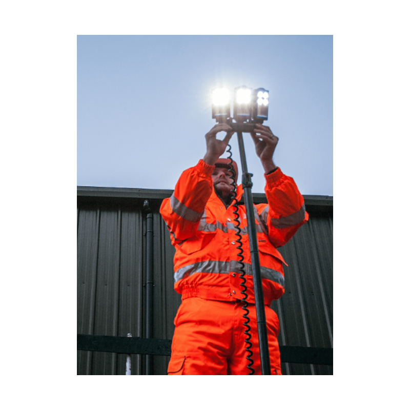 Grazie al suo grado di protezione IP54, l'ELC K10 LED Torre Faro 2xLi è resistente alla polvere e agli spruzzi d'acqua, rendendolo ideale per l'uso in ambienti difficili come cantieri, operazioni di soccorso e manutenzione industriale.